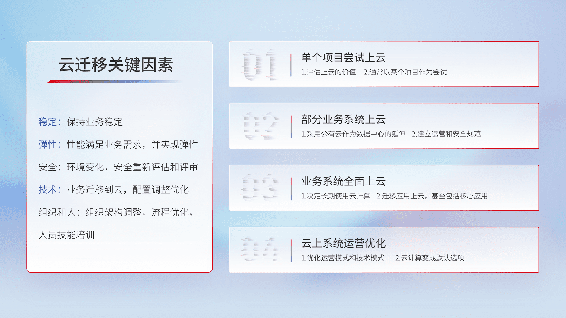 结合实际业务,,,从规划设计、、、、云平台选型、、、云原生改造、、、、数据迁移、、、集成交付,,,迁移全过程为客户识别最佳上云路径,,做好风险识别管理,,设计网络架构、、、身份权限、、、、安全审计合规、、、、操作审计、、日志审计、、、、监控告警策略、、、多站点容灾设计等,,对云上基础设施进行整体规划,,,,提升IT治理水平,,以满足弹性、、高可用、、高性能的需求。。。。