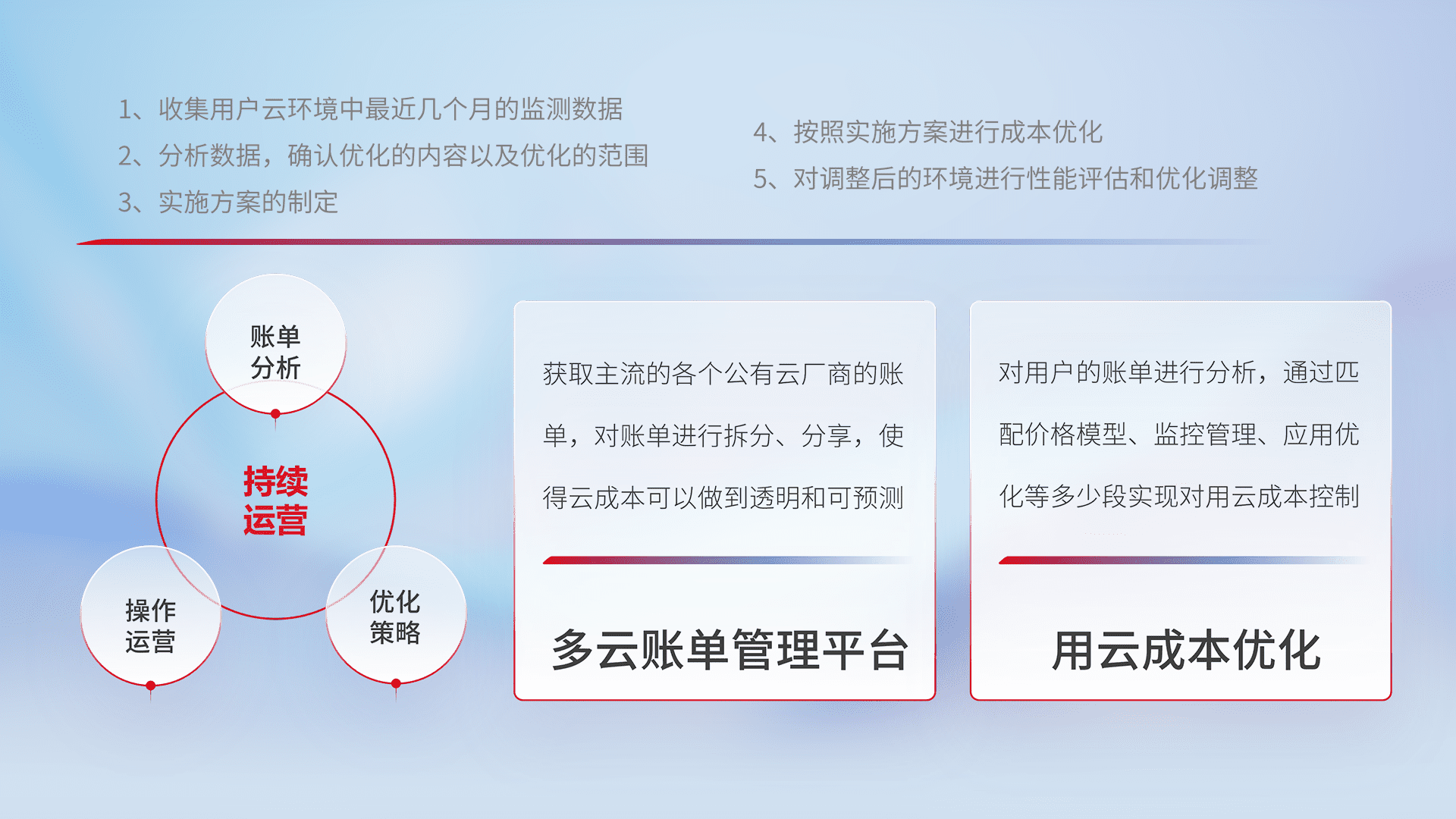 通过多云纳管,,以统一的资源数据模型把客户的云资源进行抽象和封装,,进而实现对多云资源的统一操作,,,,保障云资源管理的可靠性、、稳定性与可用性。。。量身定制化运维内容,,,配置、、、开发运维、、补丁管理、、、、备份、、、监控、、、、认证和访问管理、、审计和日常巡检等,,保障在用云过程中的可靠度,,,,稳定度以及高可用率。。